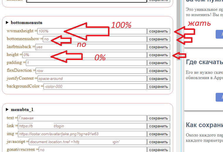 Жмите "СОХРАНИТЬ" после изменения параметровЯ понимаю, но так сложилось исторически. Просто прописывайте открытие нужной ссылки в поле JAVASCRIPT в формате, который там указан и жмите сохранить. Не думайте об остальных параметрах. Разработка мобильного приложения идёт уже не первый год, поэтому некоторые вещи оставлегны для поддержки старых версий.